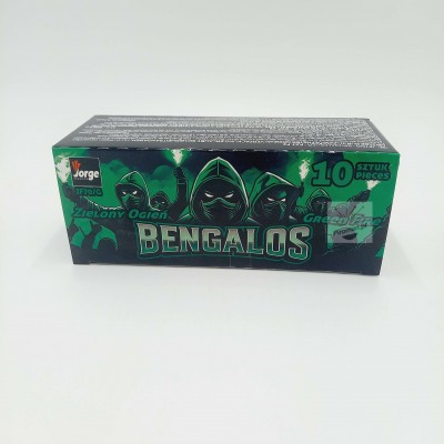 Ognie wrocławskie Bengalos JF70/G od Jorge 10 sztuk to intensywnie zielone pochodnie dymno-świetlne, idealne do opraw meczowych, sesji zdjęciowych, eventów i akcji kibicowskich. Dają mocny, nasycony kolor oraz stabilne i efektowne spalanie, tworząc wyrazisty klimat każdego wydarzenia. Niezawodny zapłon i prosta obsługa sprawiają, że produkt jest chętnie wybierany przez osoby szukające silnego efektu wizualnego w sprawdzonej jakości marki Jorge.