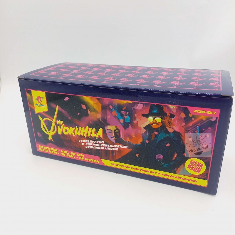 Wyrzutnia V wie Vokuhila AC20-35-1 od Albert to efektowna bateria 35 strzałów o kalibrze 20 mm, wyróżniająca się dynamiczną sekwencją i ciekawym układem wystrzałów. Kolorowe efekty, szybkie tempo oraz zróżnicowane rozbłyski tworzą widowisko, które przyciąga uwagę i buduje emocje. Idealna na sylwestra, imprezy plenerowe oraz różnego rodzaju uroczystości. Stabilna konstrukcja i pewny zapłon zapewniają bezpieczne i wygodne użytkowanie, a finał pozostawia świetne wrażenie.